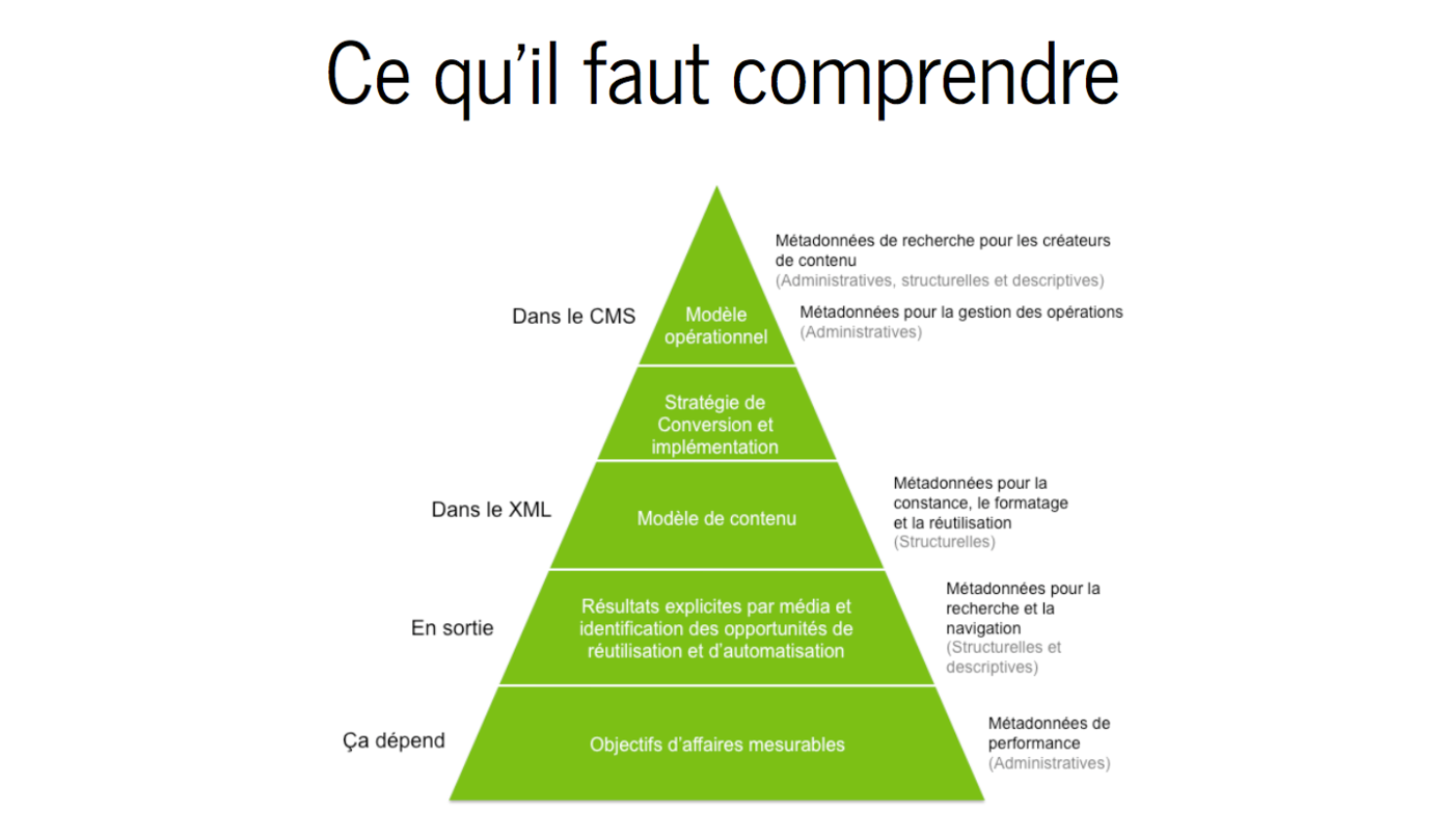 France Baril nous a proposé, à cette occasion, une courte introduction où elle nous fournit sa définition des métadonnées et comment elles peuvent être exploitées. Le plus important à retenir de cette introduction est surement cette pyramide de classification des métadonnées en fonction de l’utilisation que nous en faisons.